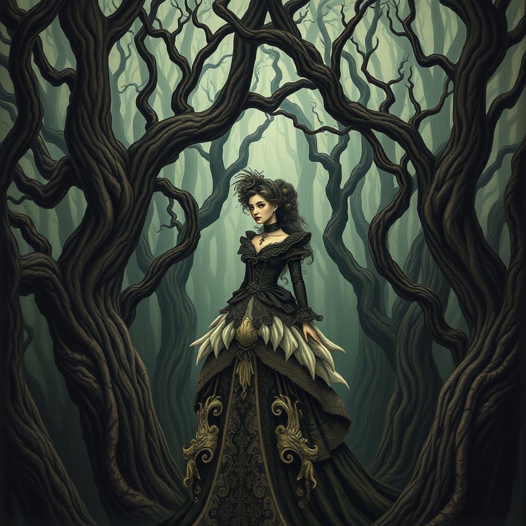 This image shows a woman in a dark forest, surrounded by gnarled trees, wearing an elegant Victorian gown. The image has a dark whimsical style.