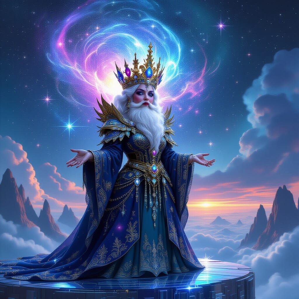 This image depicts a regal dwarf queen in jeweled high fashion, with a galaxy-inspired crown. She stands on a crystal platform, overlooking a cosmic scene with an expression of deep wisdom. The art style blends fantasy concept art and surrealism with an otherworldly glow.
