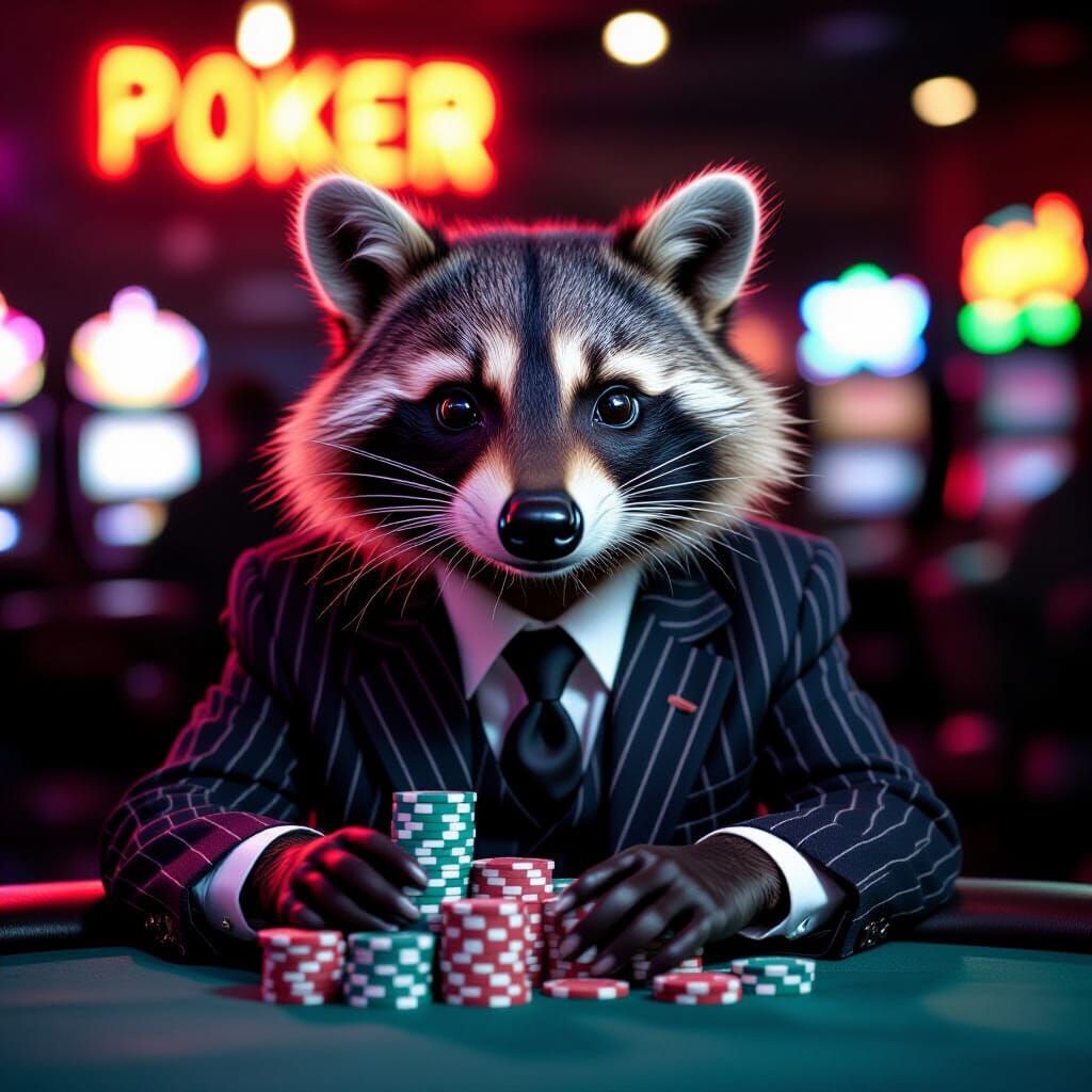 This image shows a raccoon dressed in a pinstripe suit, carefully counting poker chips illuminated by vibrant neon lights. The artwork has a distinctive film noir aesthetic.