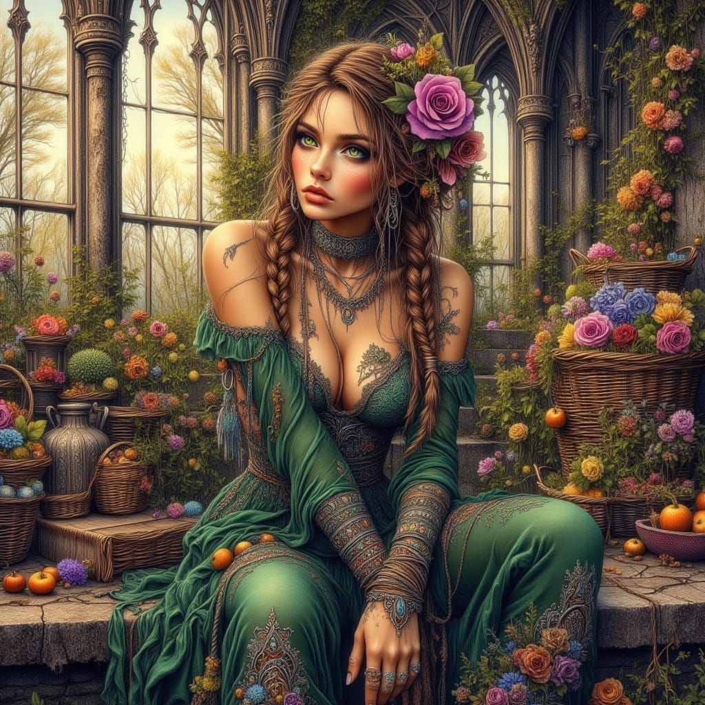 This image depicts a German noblewoman surrounded by an overflowing lush tapestry of flowers, seated on a stone bench with a grand Gothic window as a backdrop, blending the styles of Carne Griffiths and Josephine Wall