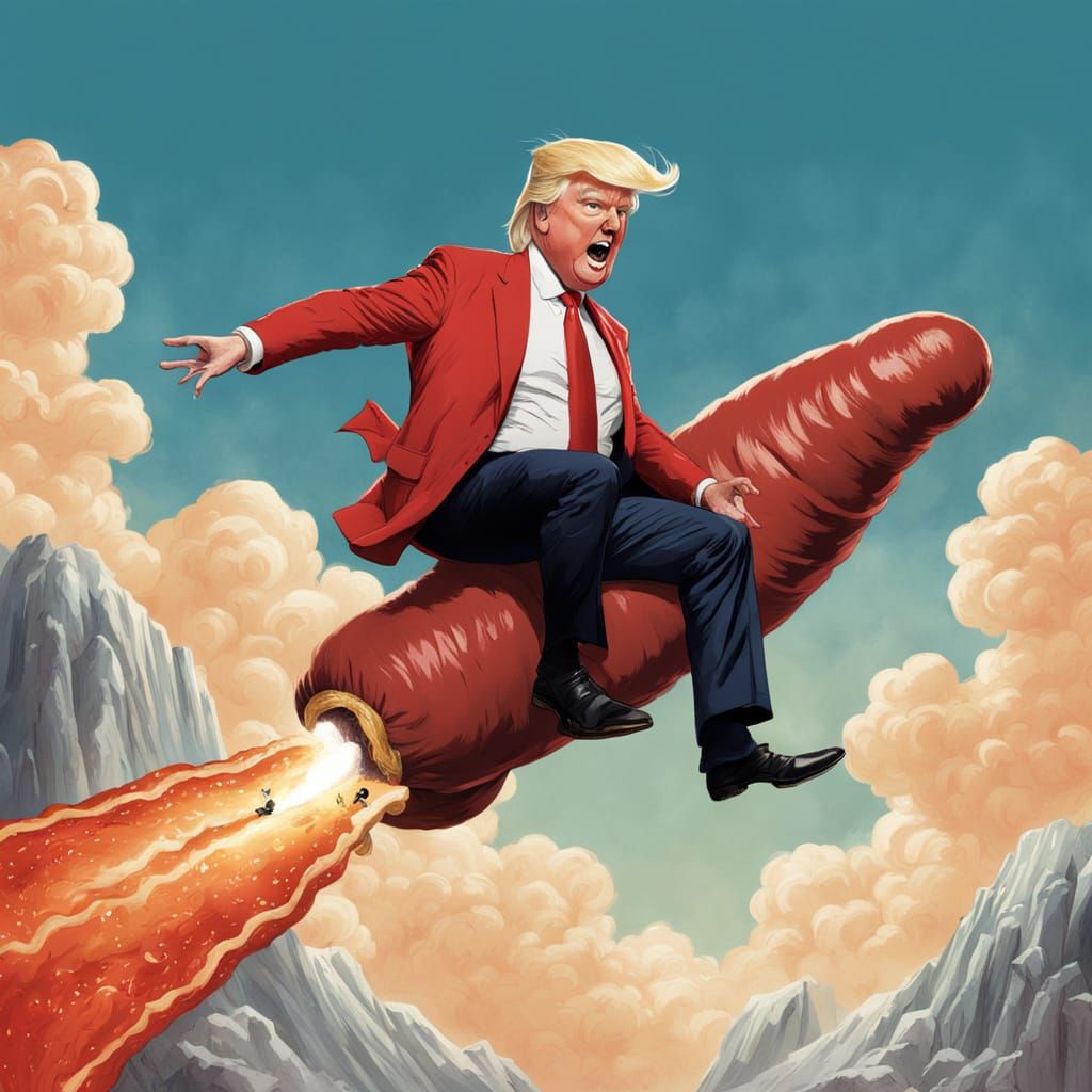 A surreal image shows Donald Trump riding a giant sausage with a manic grin. The fantastical scene features Trump in his trademark red suit and white hair.