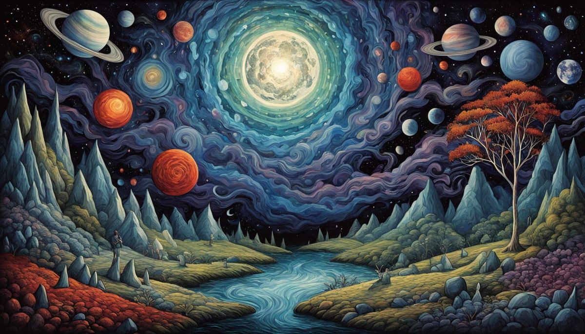 This digital artwork depicts a complex composition of bio art elements, including glowing figures and a textured network, set against a backdrop of serene nature scenes and abstract designs, showcasing strong absorption in the blue-violet spectrum and weaker absorption in the red-green range.