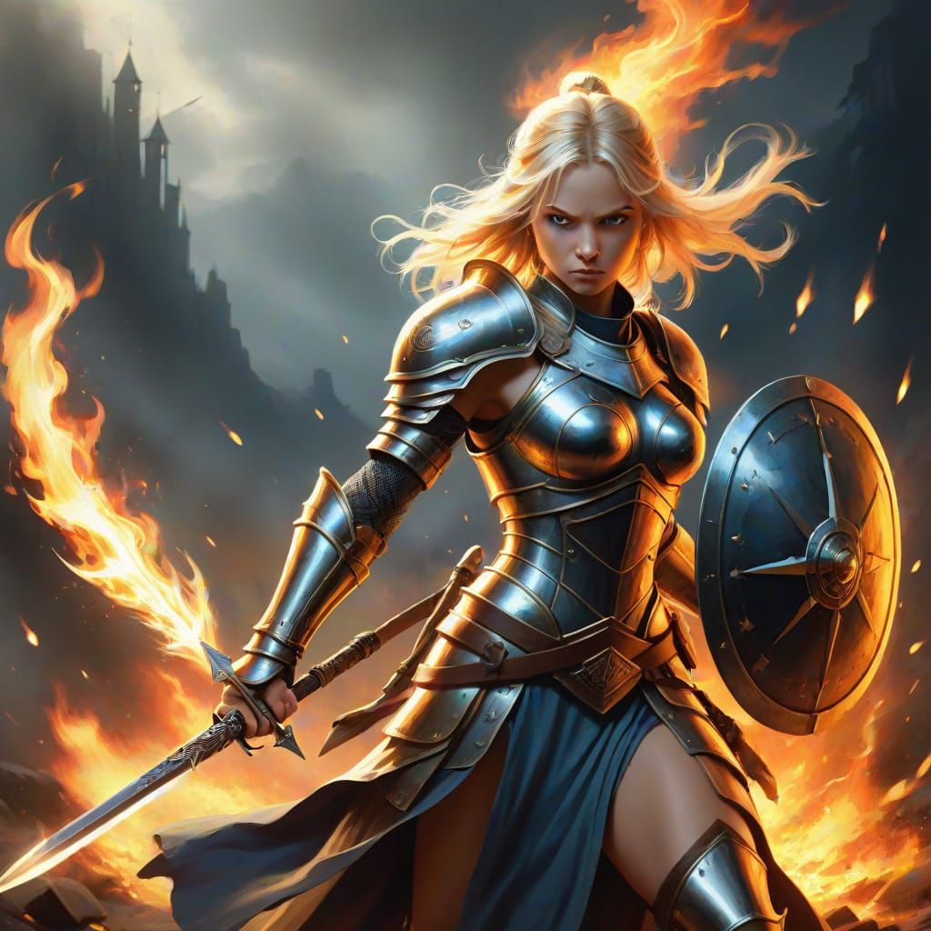 This image shows a fully armored blonde woman warrior in an epic battle. She defends herself with a sword and shield against a man shooting flaming arrows in this digital painting.