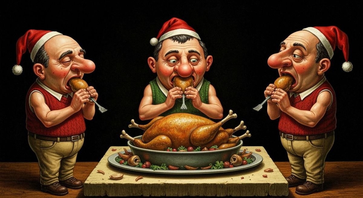 This image shows a darkly humorous parody of a Christmas feast. Three figures gorge on poultry, depicted in vivid, contrasting colors with dramatic lighting and unsettling undertones.