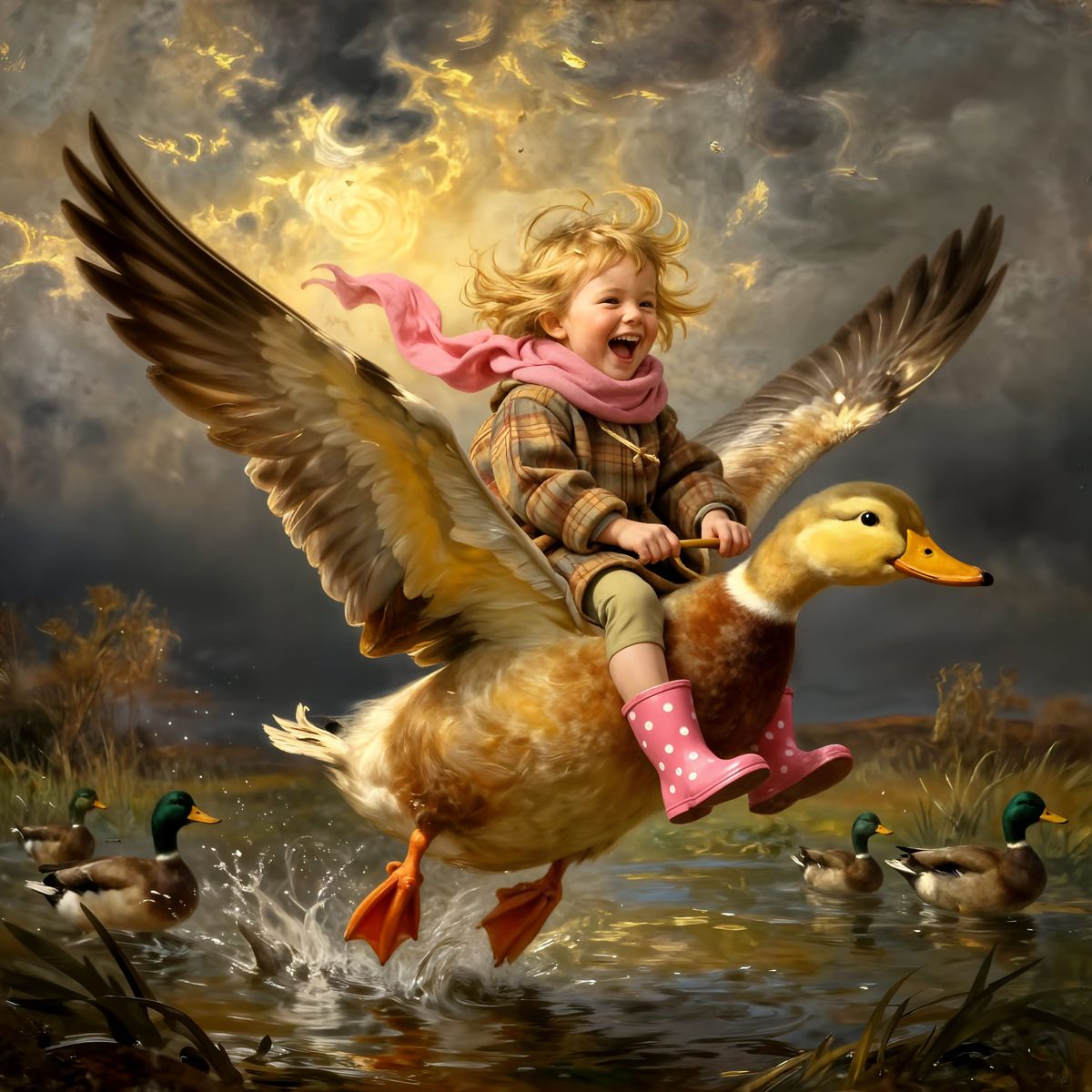 A magical, highly detailed oil painting of a young child laughing joyfully while riding a giant mallard duck flying over a stormy marsh. The child has windblown blond hair, a warm plaid coat, a pink scarf fluttering in the wind, and wears bright pink polka-dot rain boots. The duck is massive, with powerful ...