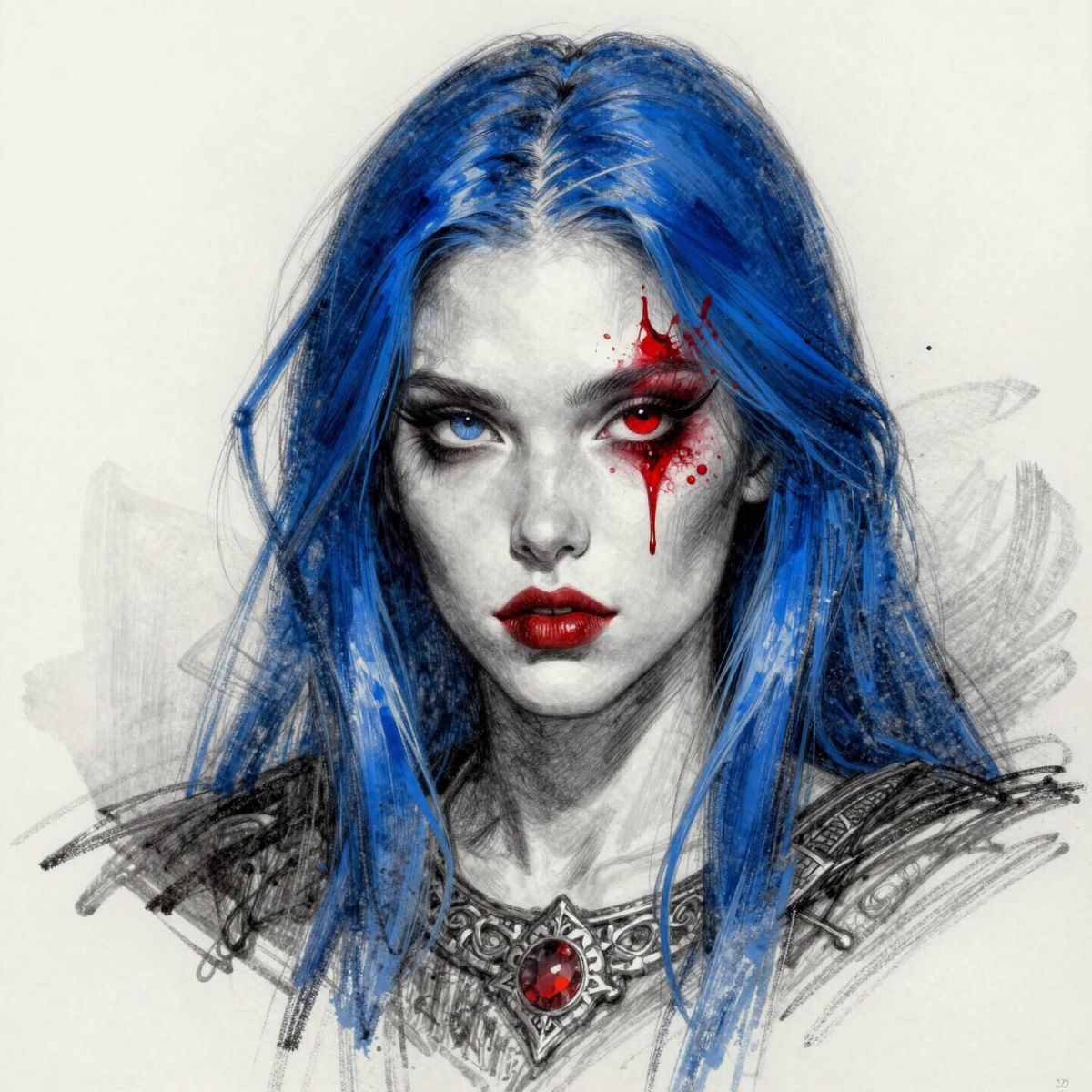 This image is an abstract pencil sketch featuring medieval elements with striking cerulean and ruby color accents, rendered in a unique, edgy style.