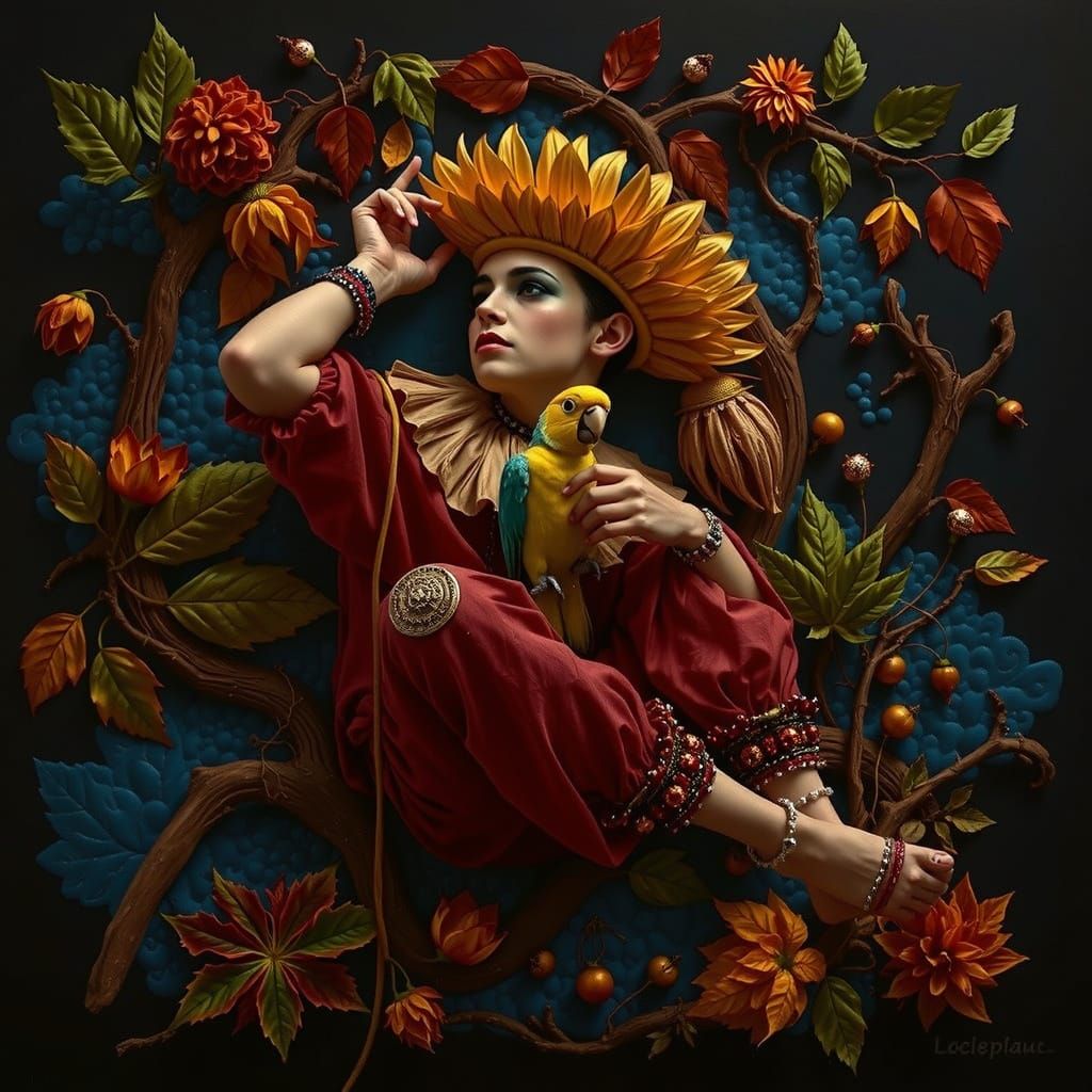 This image depicts a Chimaera merging concepts of birth, death, and infinity against a backdrop of vibrant natural elements. Rendered in a photorealistic style with Cloisonné influences.