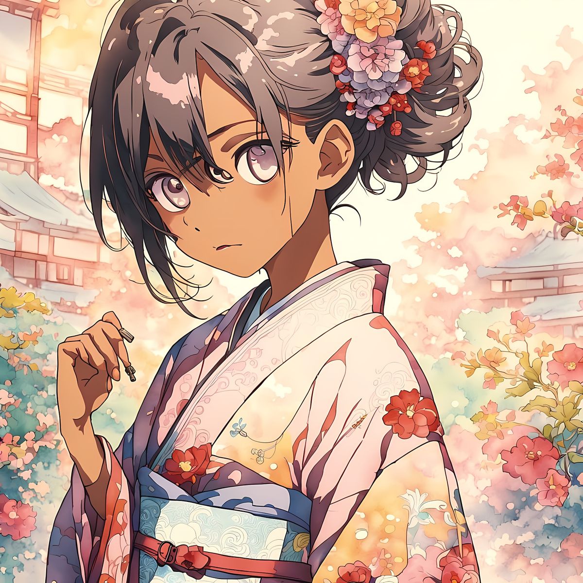This image shows an anime girl with tan skin in a vintage kimono with floral patterns, standing in a serene Japanese garden. This digital artwork is in a manga style.