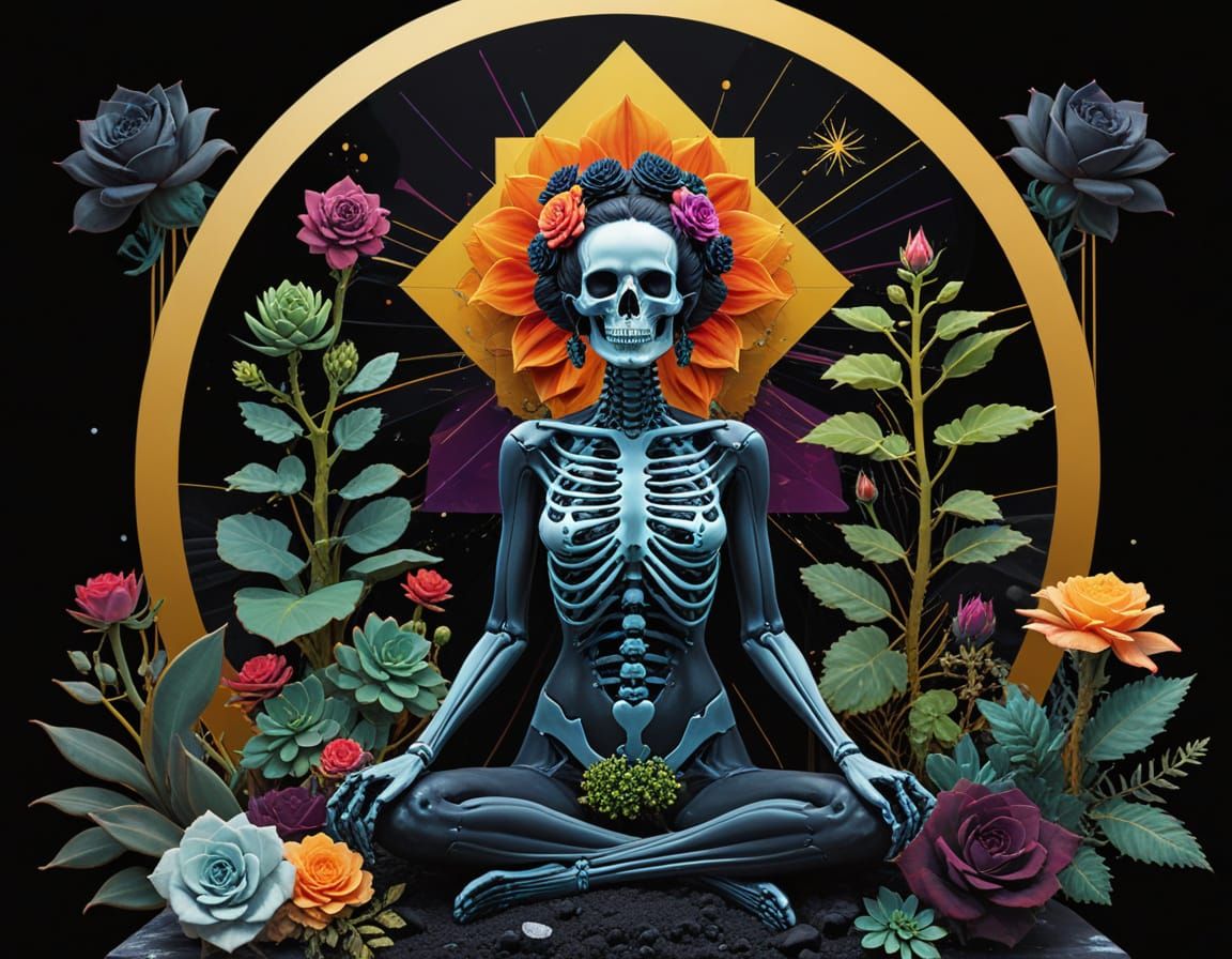 This image shows a dark goddess altar adorned with succulents, flowers, black roses, and crystal clusters. The artwork features triadic colors and a geometric Bauhaus design, rendered as digital pop art.
