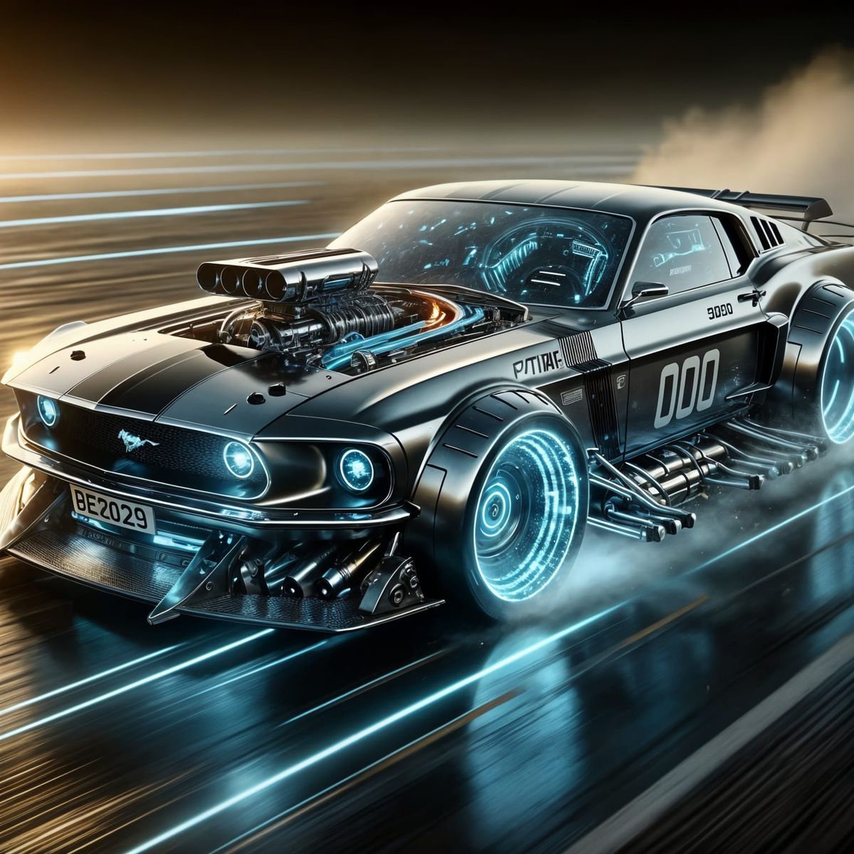 A photorealistic image of a Mustang Boss 429 reimagined for the year 3000, shown in dynamic motion. The design incorporates advanced aerodynamics, visible high-tech suspension, and futuristic enhancements.
