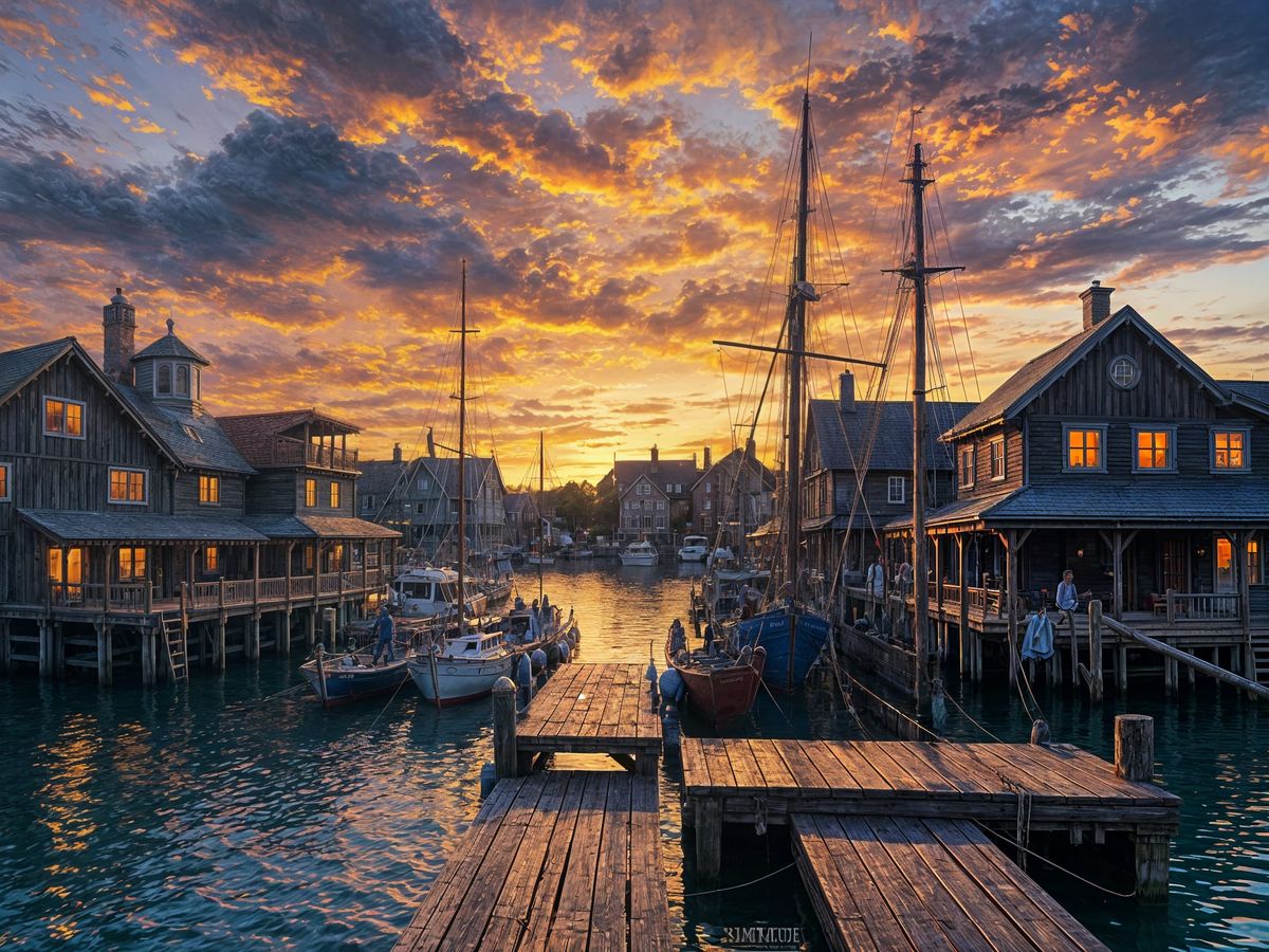 A hyperrealistic painting of a vibrant fishing village at sunset. The image depicts wooden houses, a sailing ship being unloaded at the pier, and reflections in the water with impasto techniques.