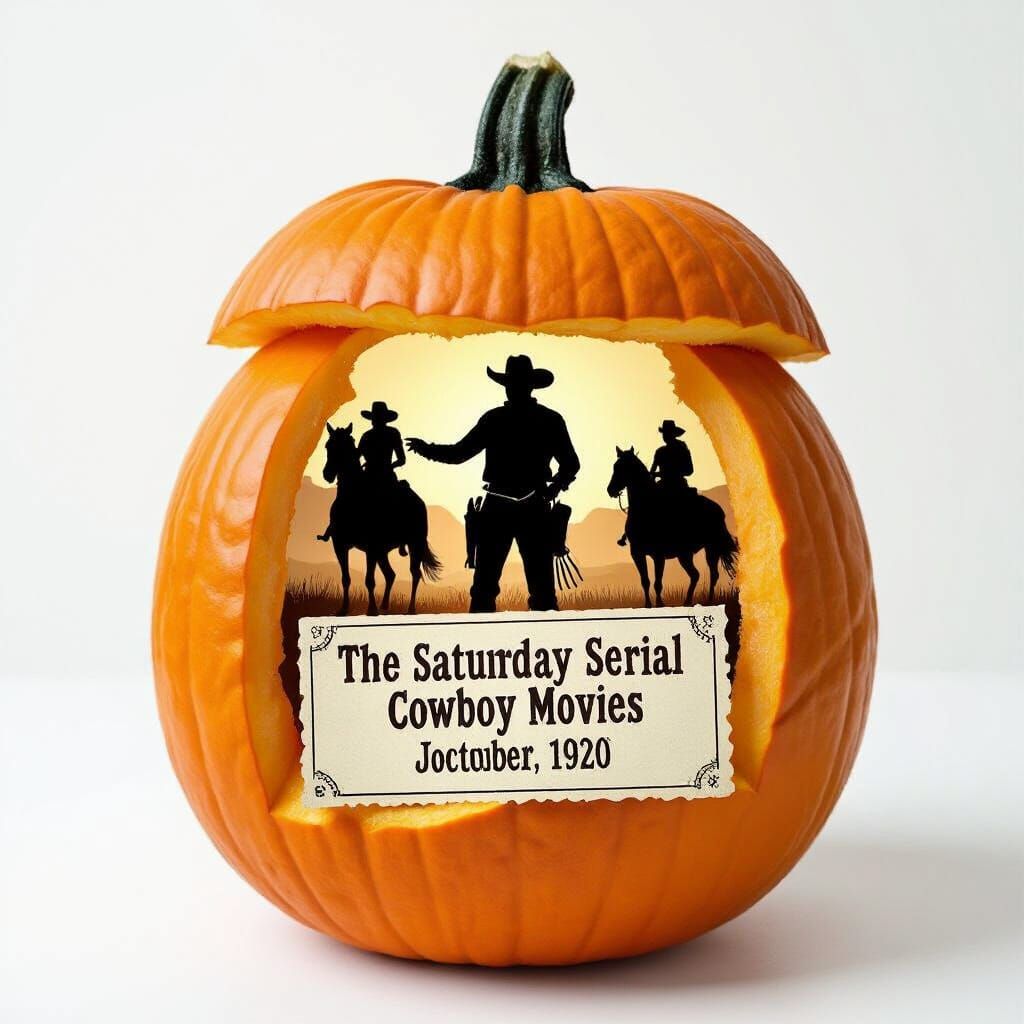 This image depicts a surreal scene of classic cowboy movie elements contained within a massive pumpkin, evoking a unique and whimsical visual narrative.