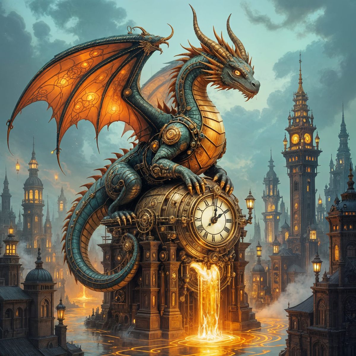 A detailed illustration of a majestic steampunk dragon with brass gears and glowing tubes, perched above a clockwork city. A river of molten gold flows below, with iridescent scales reflecting gaslight.