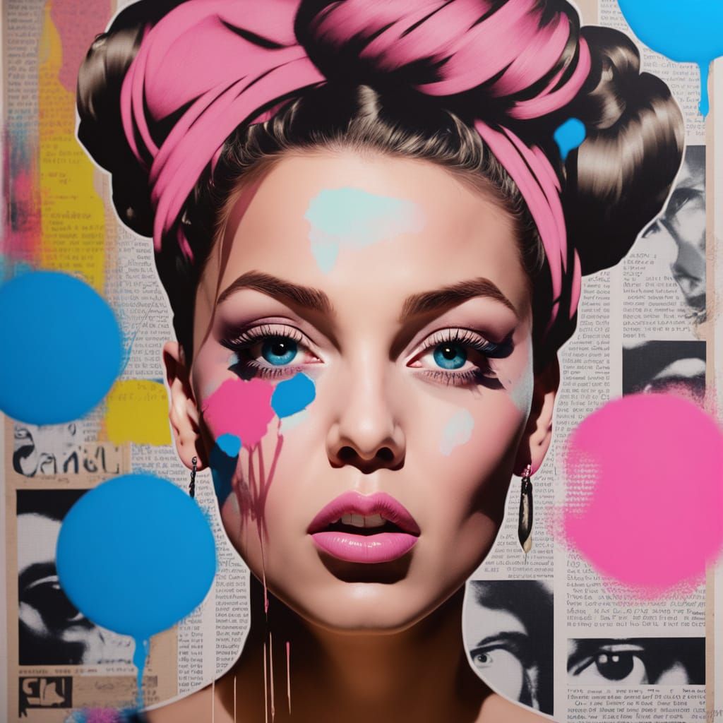 A vibrant woman with her natural hair styled up, adorned with colorful dreadlocks swirling around her scalp ina bun, gazes directly at the viewer with her big bright oversized blue "evil eyes." Her full, pink lips are puckered in order to blow a giant semi clear soft pink bubble from her bubble gum, ...