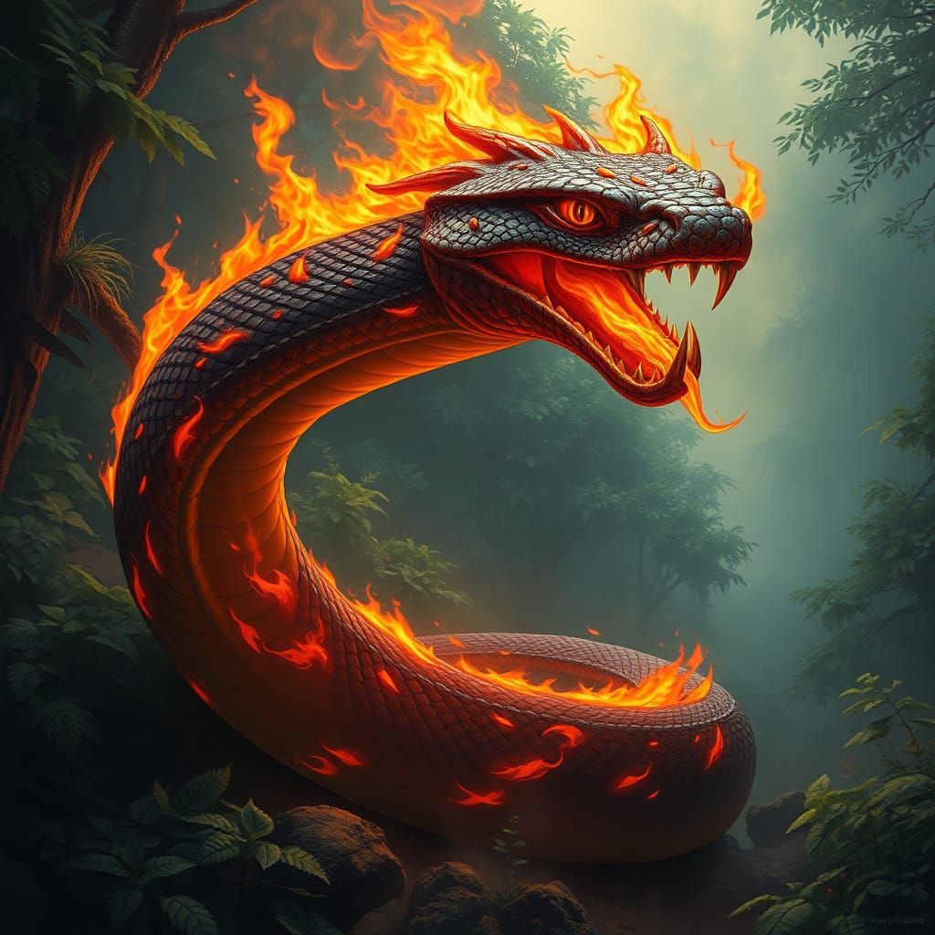 This image shows a massive, coiled serpent, its body ablaze with dancing flames, set amidst a lush, misty wilderness with dense foliage. The artwork is reminiscent of a fantasy illustration, with dramatic lighting and intense textures.
