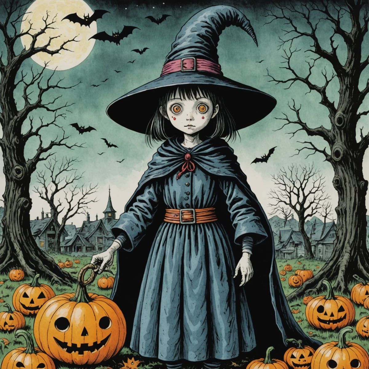 This image depicts a detailed ink drawing of a worm in a Halloween witch costume, rendered in a masterful horror manga style.