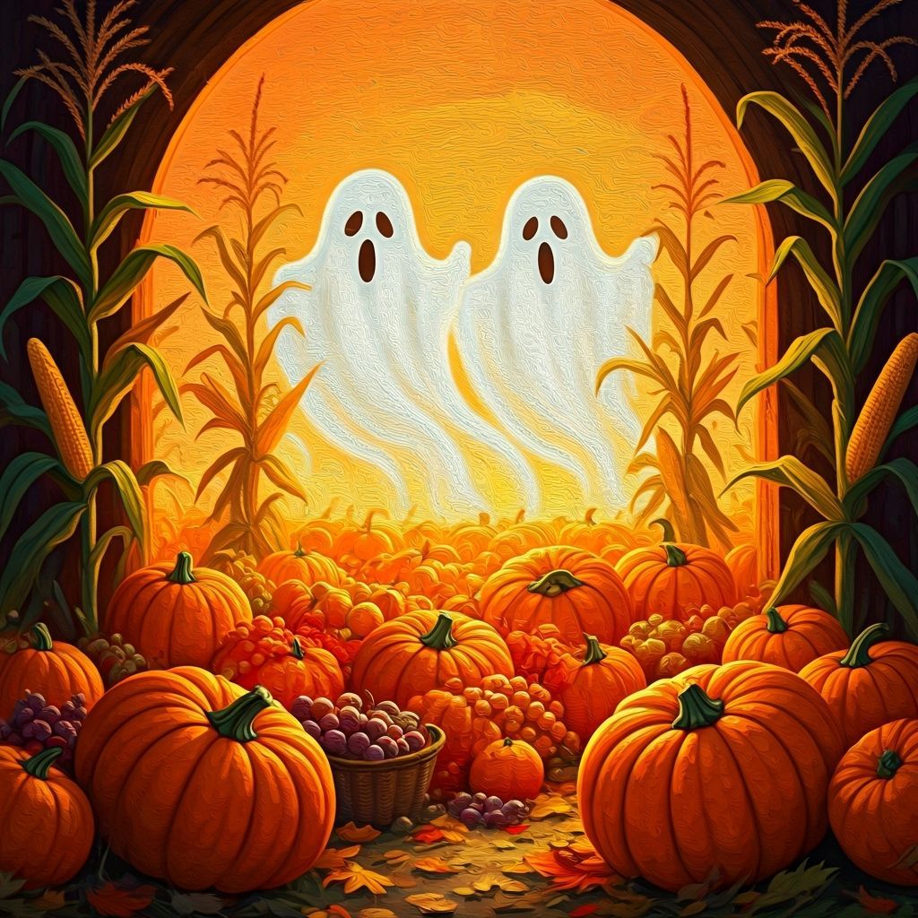 This image depicts a lively harvest festival scene with pumpkins, corn stalks, and autumn leaves. Ethereal ghosts float gracefully, illuminated by a golden hour glow, in a painterly style with expressive brushstrokes.