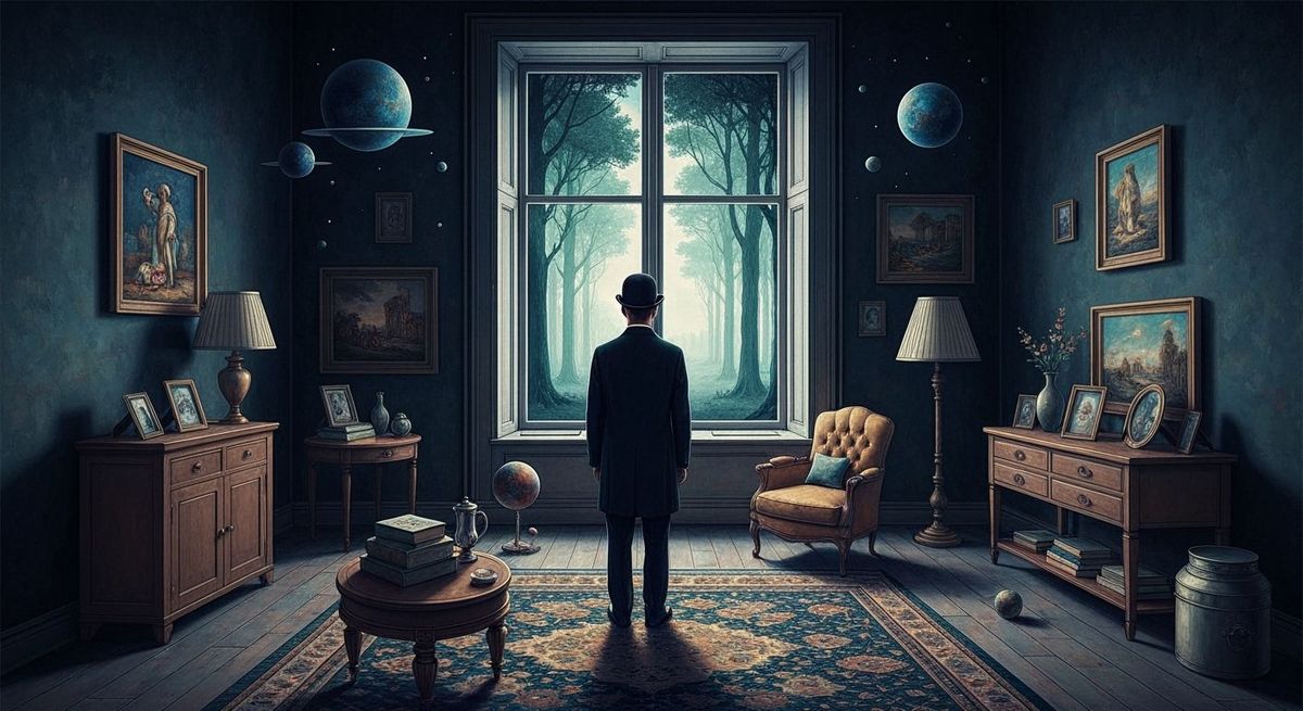 This image depicts a man in a bowler hat inside a cosmic living room, observing a surreal forest through a window. Rendered in a distinctive clear line style with thick brushstrokes, evoking dreamlike, museum-quality impressionism.