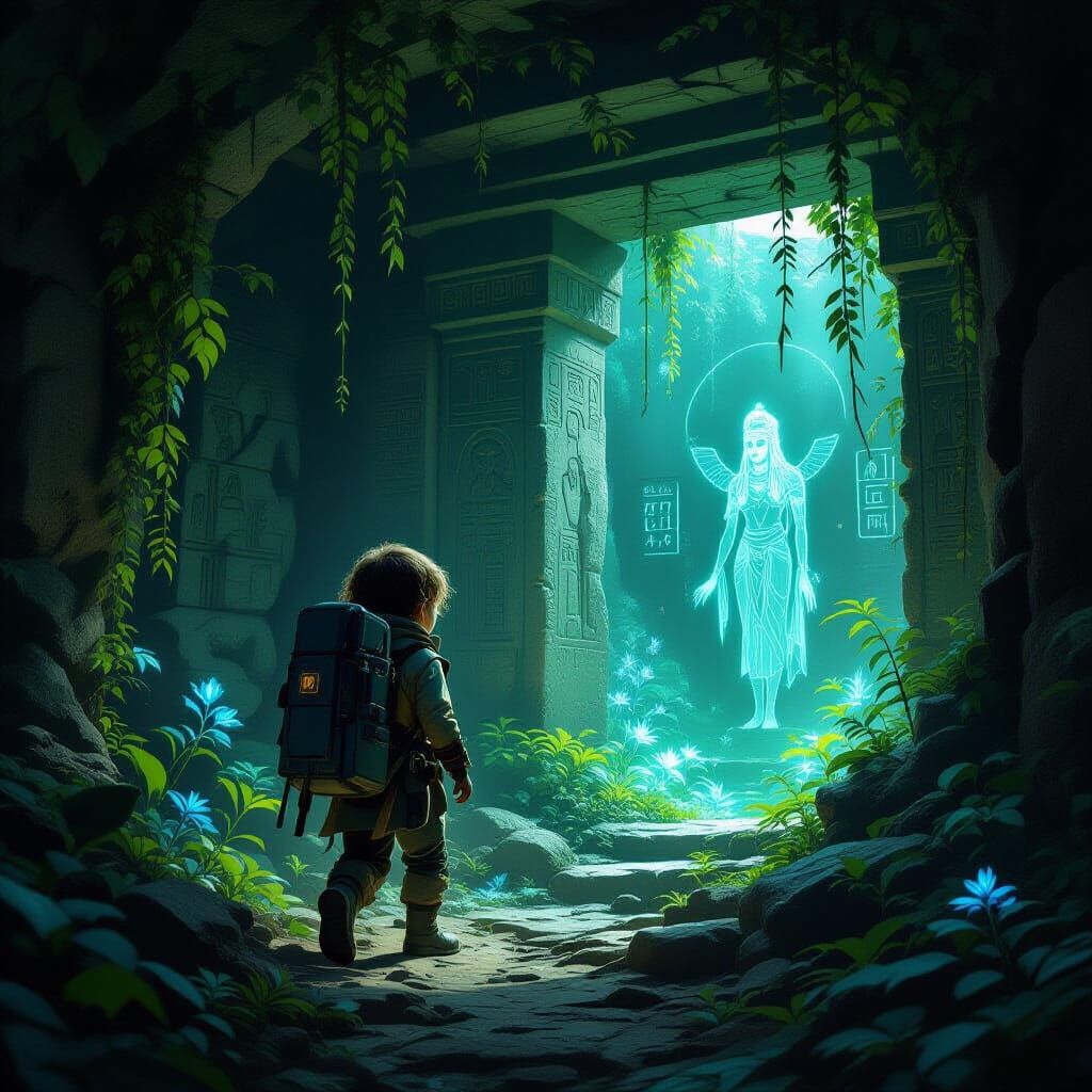 This hyperrealistic concept art shows a child explorer finding a hidden chamber in an overgrown lost civilization. Bioluminescent plants light up ancient hieroglyphs, creating an atmosphere of quiet wonder.