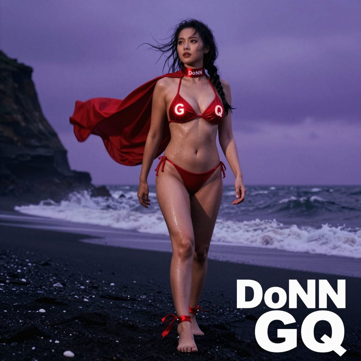 Crimson red triangle bikini with white DoNN GQ branding