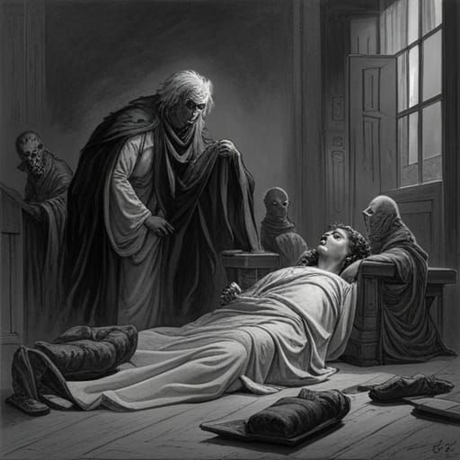 This image depicts a scene of horror. The artwork is reminiscent of dark engravings and dramatic paintings.