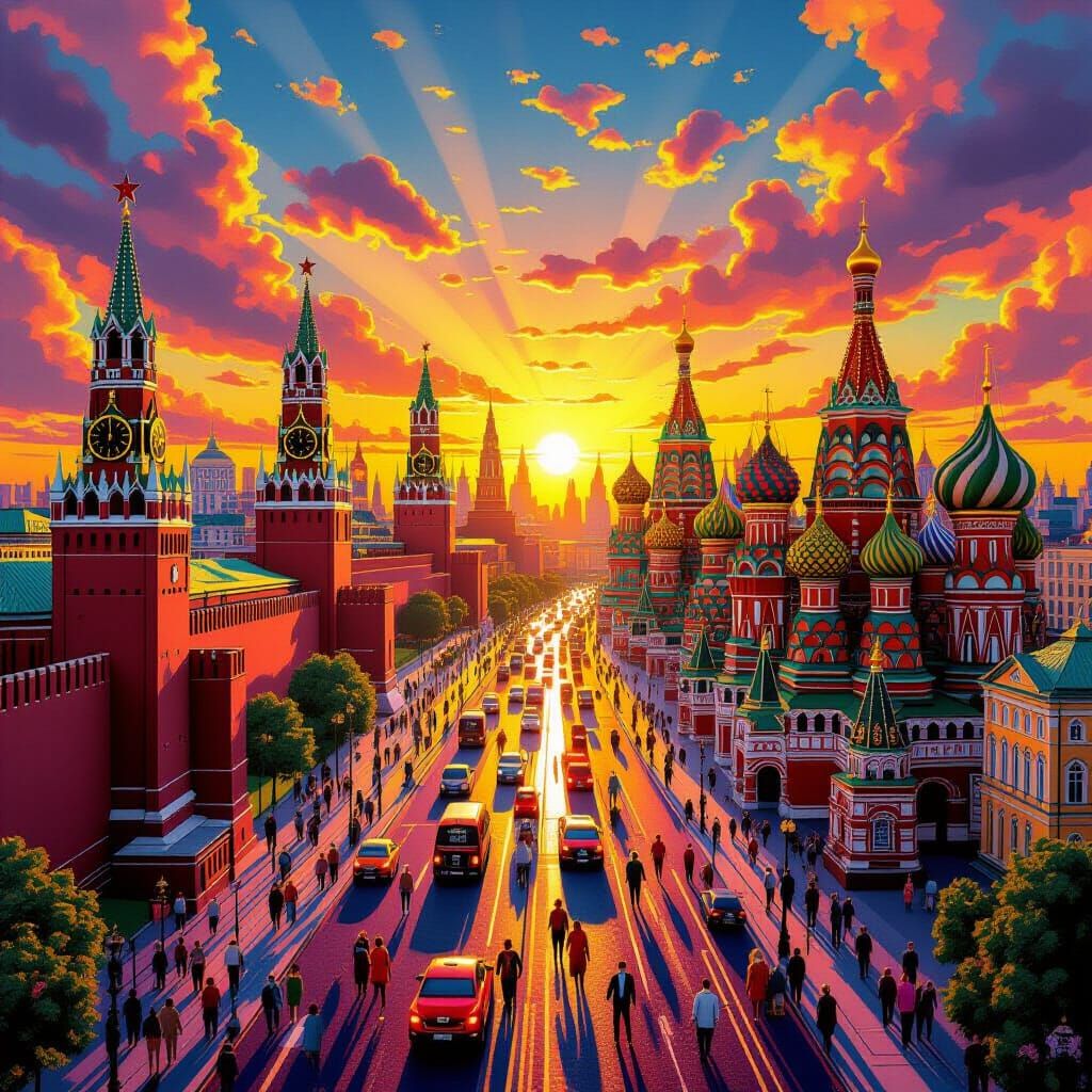This image shows a surreal cityscape made of chocolate, incorporating architectural elements from London, Paris, Moscow, and Delhi. It features a maximalist style and a sunset sky with rainbow hues.