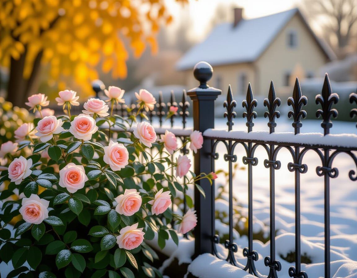 This image captures a beautiful bush of tea roses with frost and light snow in a late autumn garden, next to a decorative iron fence. Features hyperrealistic detail and natural lighting.