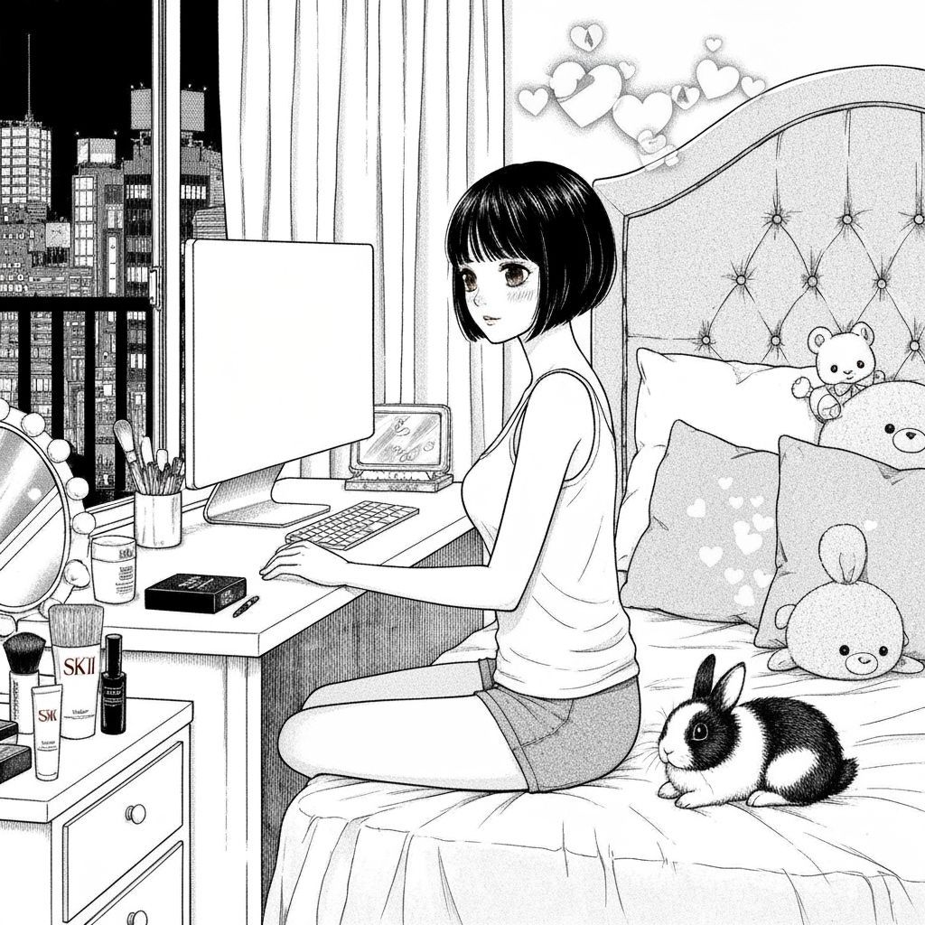 This image shows a slender woman sitting at her computer with a rabbit in a kawaii manga style. The bedroom scene includes a view of Shibuya, Tokyo at night, rendered in black and white.