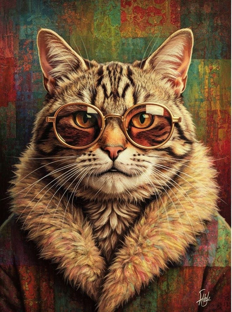 A vibrant digital painting of a scruffy cat sporting sunglasses. The artwork features rich, patchwork-like colors in an acrylic style, reminiscent of modern illustrative art.