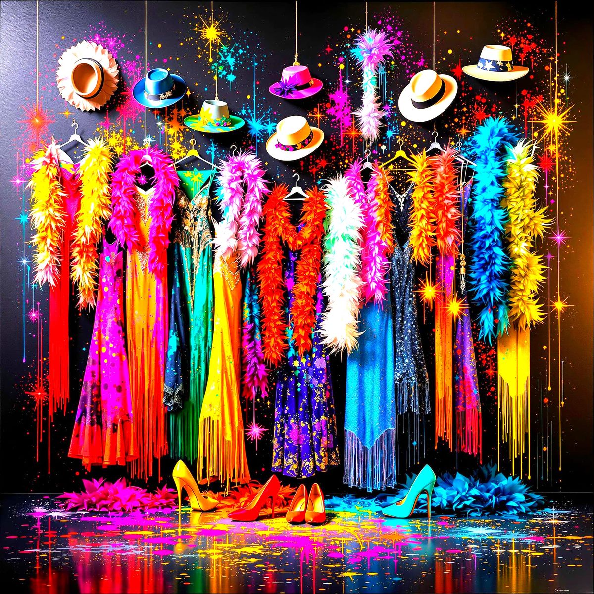 A dazzling display of 1920s dresses, scarves, hats, and shoes in luminous, vibrant colors. The scene features reflective lighting and a sparkle mist, rendered with a street art aesthetic.