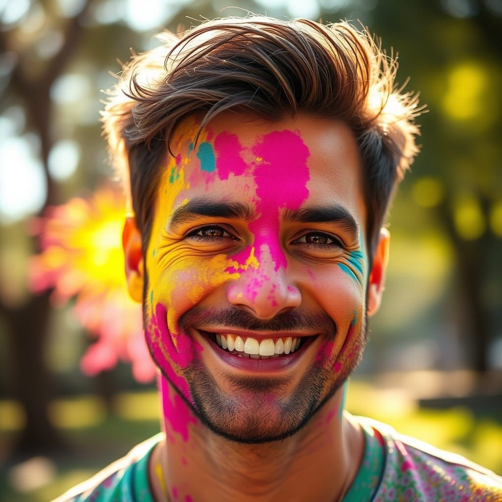 A close-up portrait of a smiling man with Holi-style color powder on his face. The soft, sunlit background features bright colors and bokeh, reminiscent of cinematic portraiture.