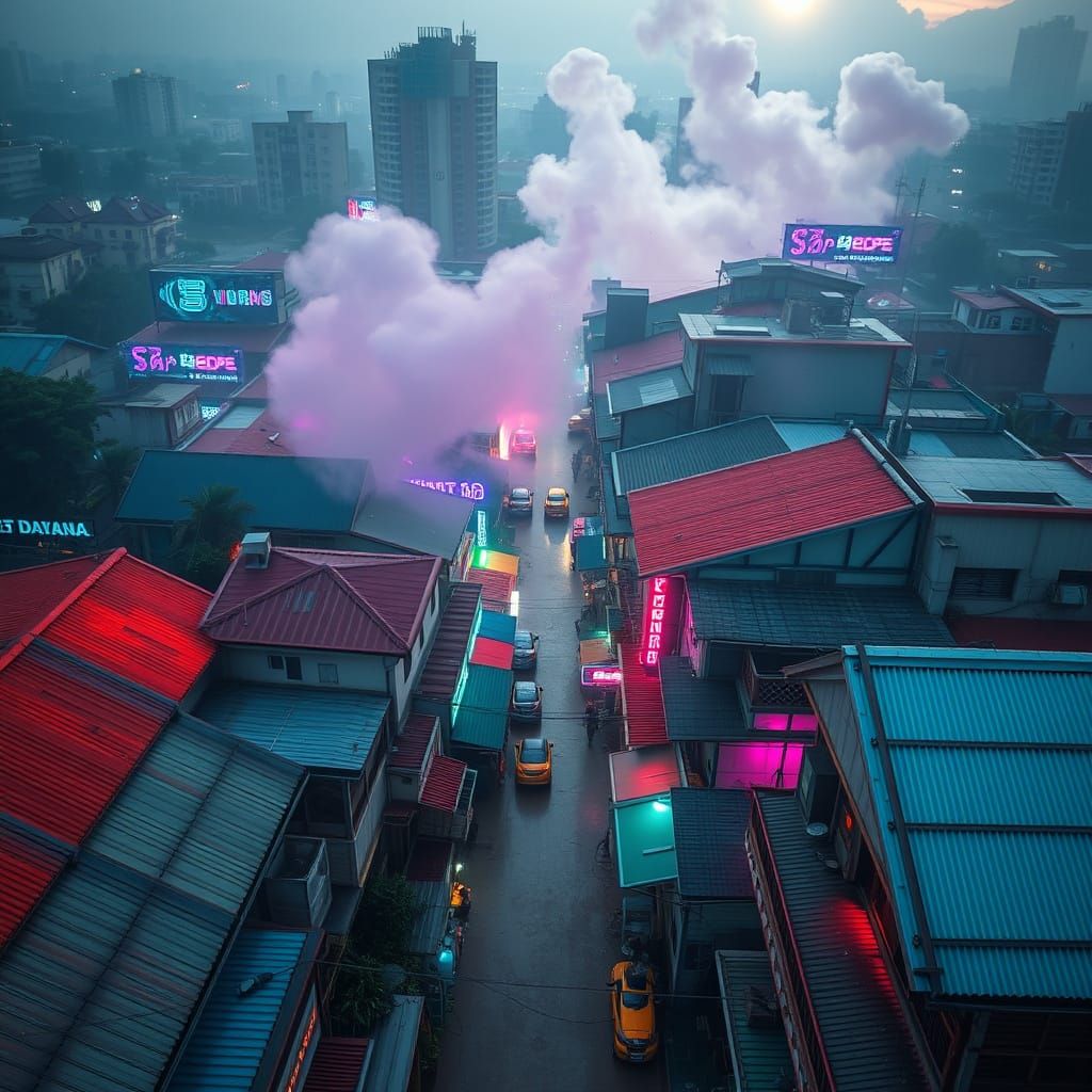 This image shows a cyber alley in Da Nang from a bird's eye view. Vibrant colored roofs and glowing rain gutters are visible in this digital art piece with a futuristic aesthetic.
