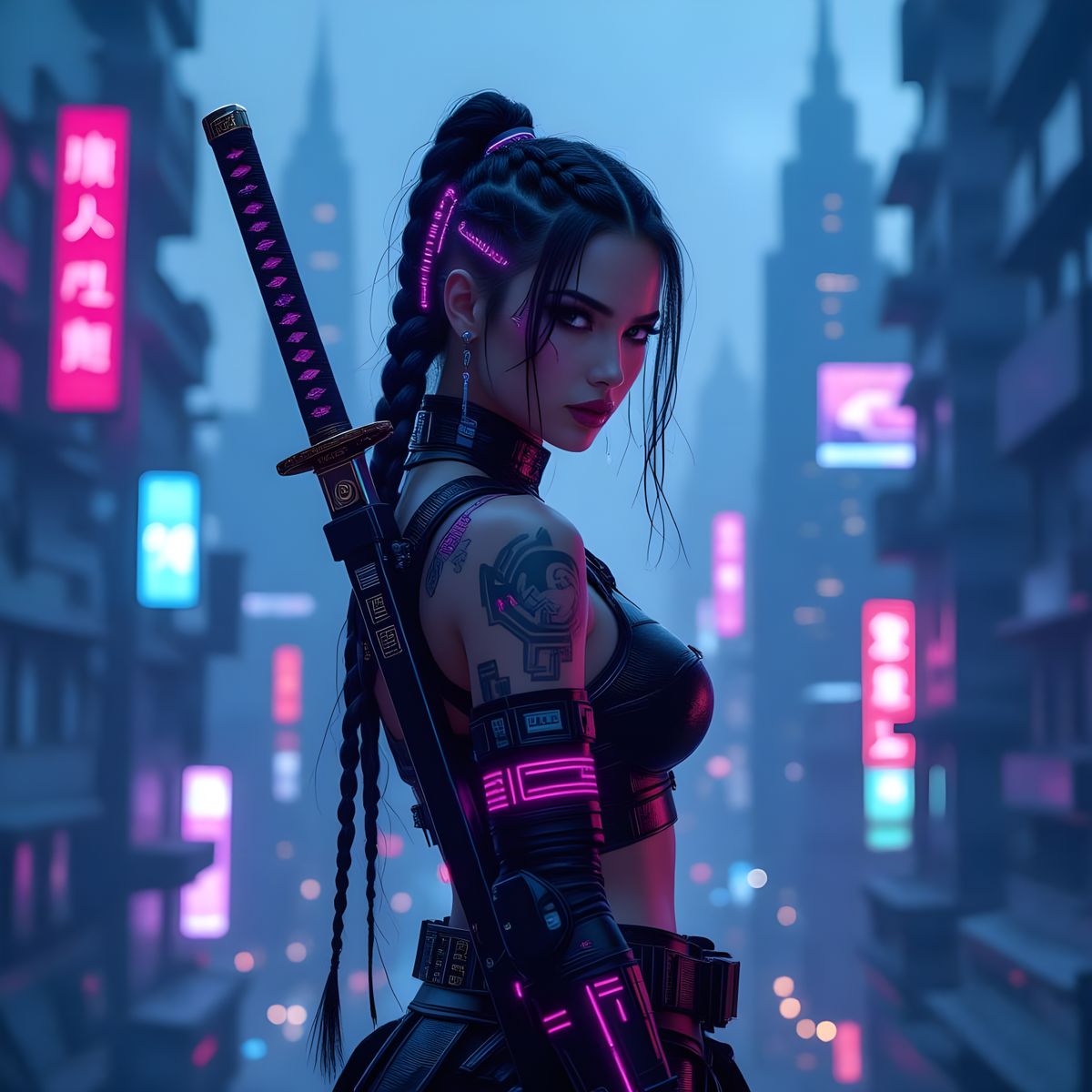 A striking image of a cyberpunk warrior princess, with neon-lit circuits in her hair, standing defiantly above a futuristic cityscape, amidst towering skyscrapers and holographic advertisements, with a gritty, dystopian atmosphere.