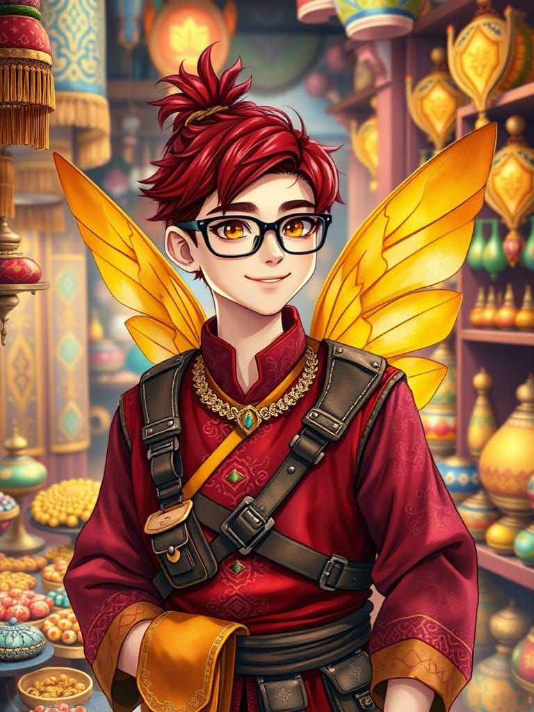 A digital anime art piece of a red-haired fairy merchant with glasses in his desert shop. The image, rendered in watercolor style, features vibrant jewelry and textiles.
