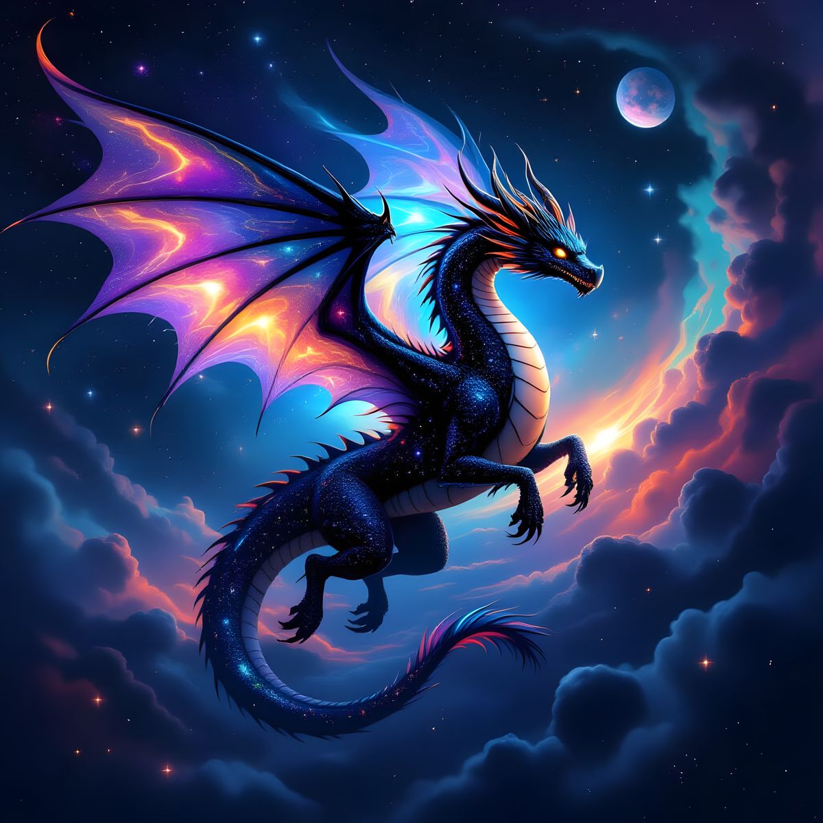This image shows a majestic dragon composed of galaxies, stars, and planets. The celestial dragon soars through space with outstretched wings, creating a stunning visual spectacle.