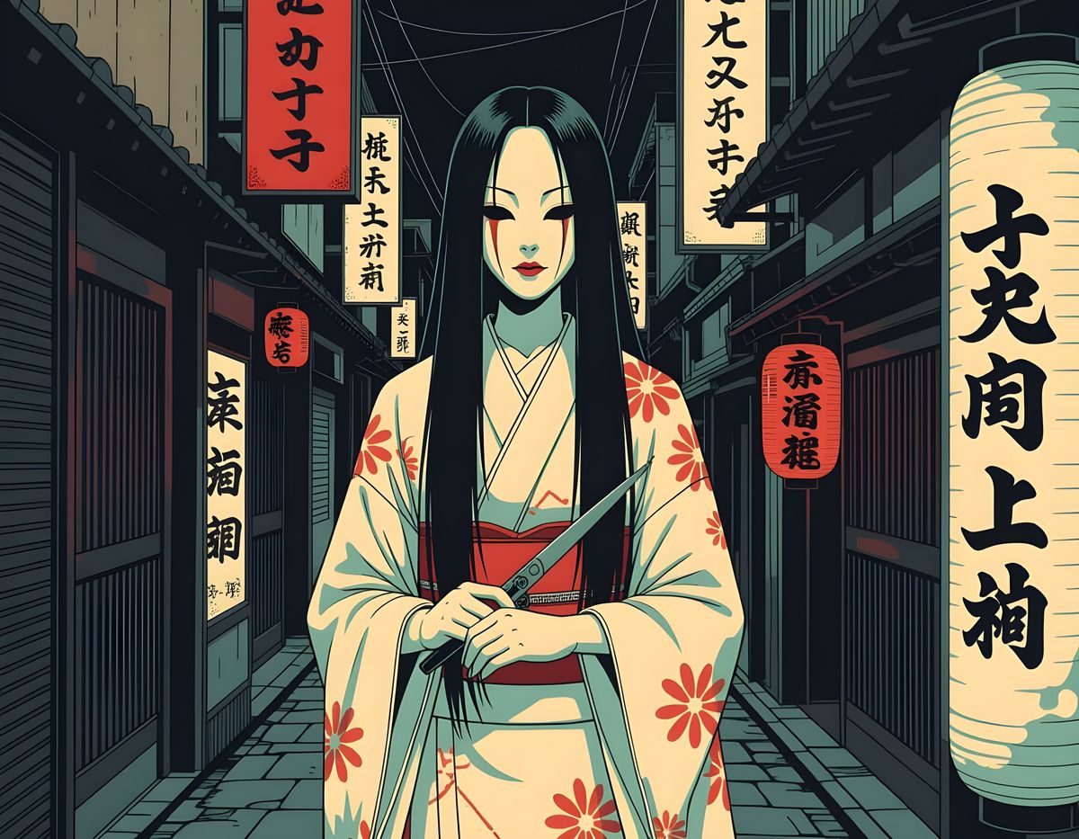 This image depicts Kuchisake-onna, a vengeful female spirit from Japanese folklore. She conceals her disfigured mouth and wields sharp objects, embodying a terrifying urban legend.