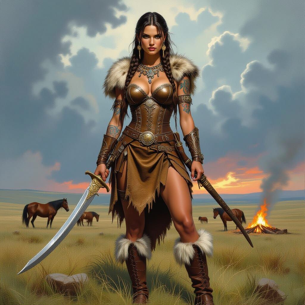 A striking picture of a Scythian warrior woman on the steppe. She wears fur-trimmed leathers and bronze armor, with intricate tattoos and braided hair. The image evokes a vibrant fantasy aesthetic.