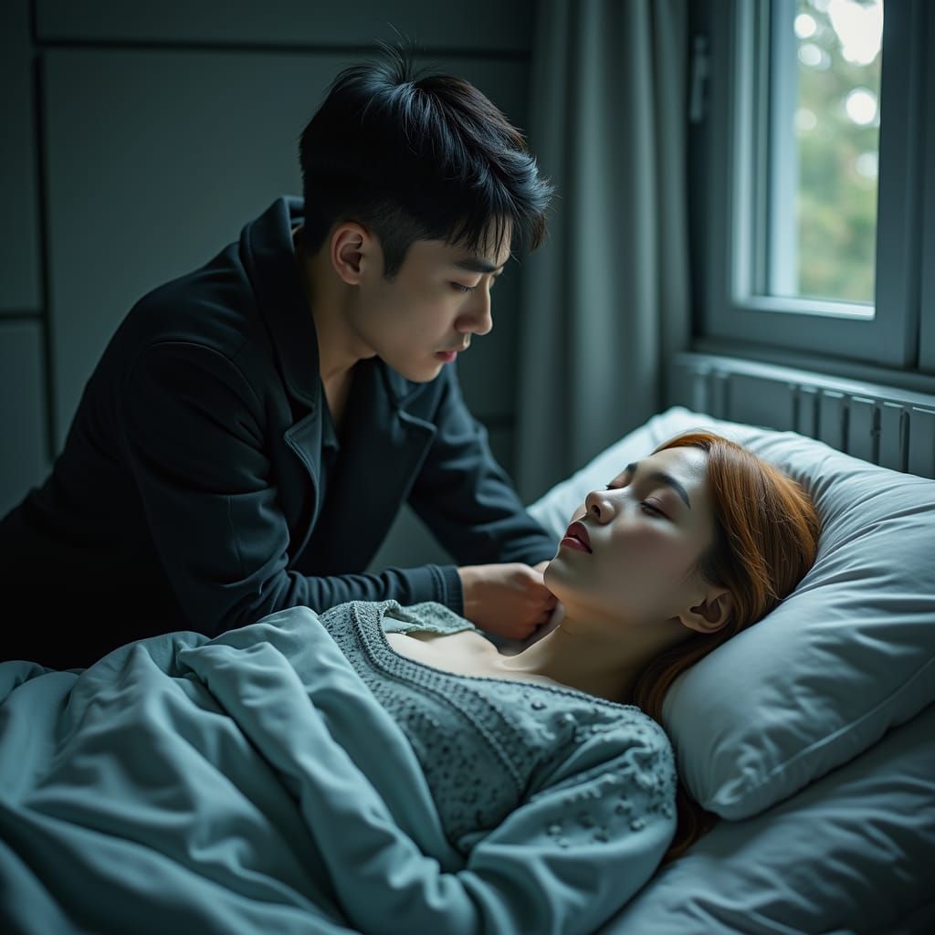 This image shows a dramatic scene of a heroic moment in a futuristic setting, with a lean Korean man tending to an injured American woman in a gray sci-fi bedroom.