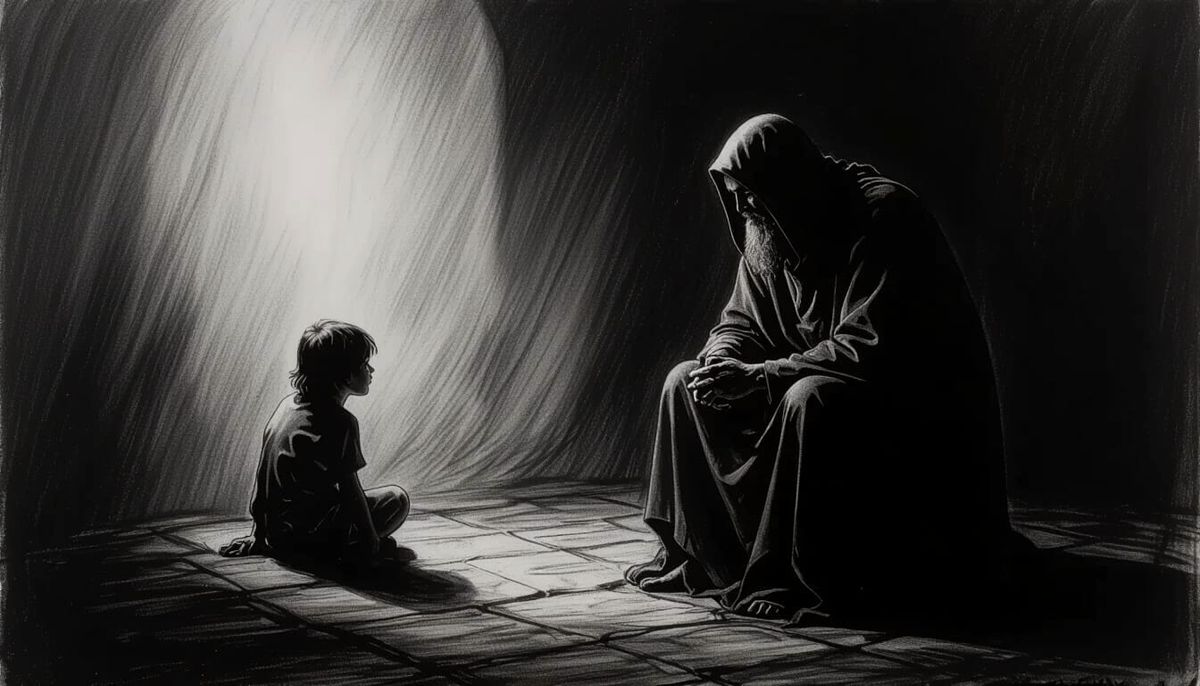 This image is a detailed charcoal drawing depicting the spiritual concept of the poor in spirit, to whom the heavenly kingdom belongs.