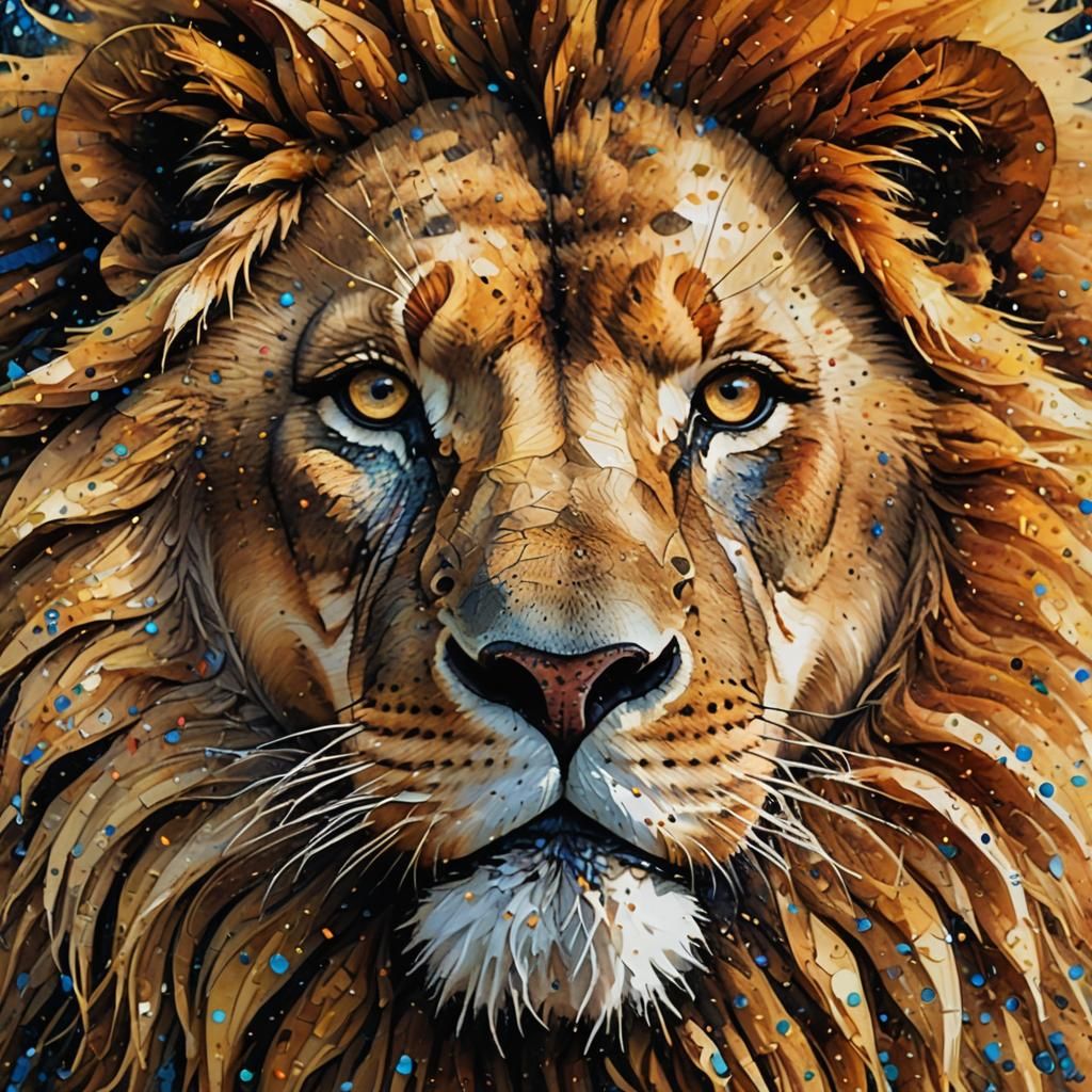 A vibrant close-up of a lion's face rendered in a pointillist style. The image features dynamic lighting, warm tones, and golden whiskers, created using thousands of tiny dots.