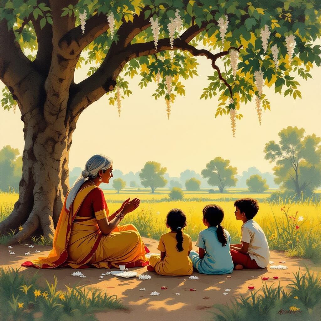 A serene image of an elderly woman in a sari teaching children in a peaceful Indian village during dawn. The art is reminiscent of vintage travel posters with impressionist brushstrokes.