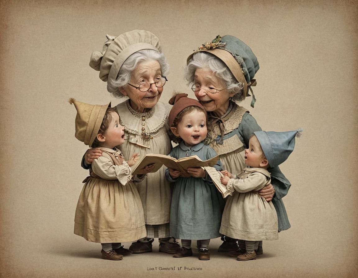 This image shows two cute toddler siblings singing a birthday song to their grandmother. The image features intricate details and a whimsical, entangled aesthetic.