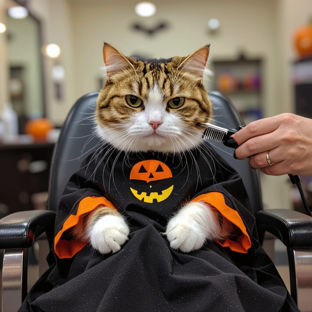 This photorealistic image shows a cute cat in a Halloween costume at a pet salon, getting its nails trimmed and fur brushed with a slightly annoyed expression. Studio lighting and high detail are used.