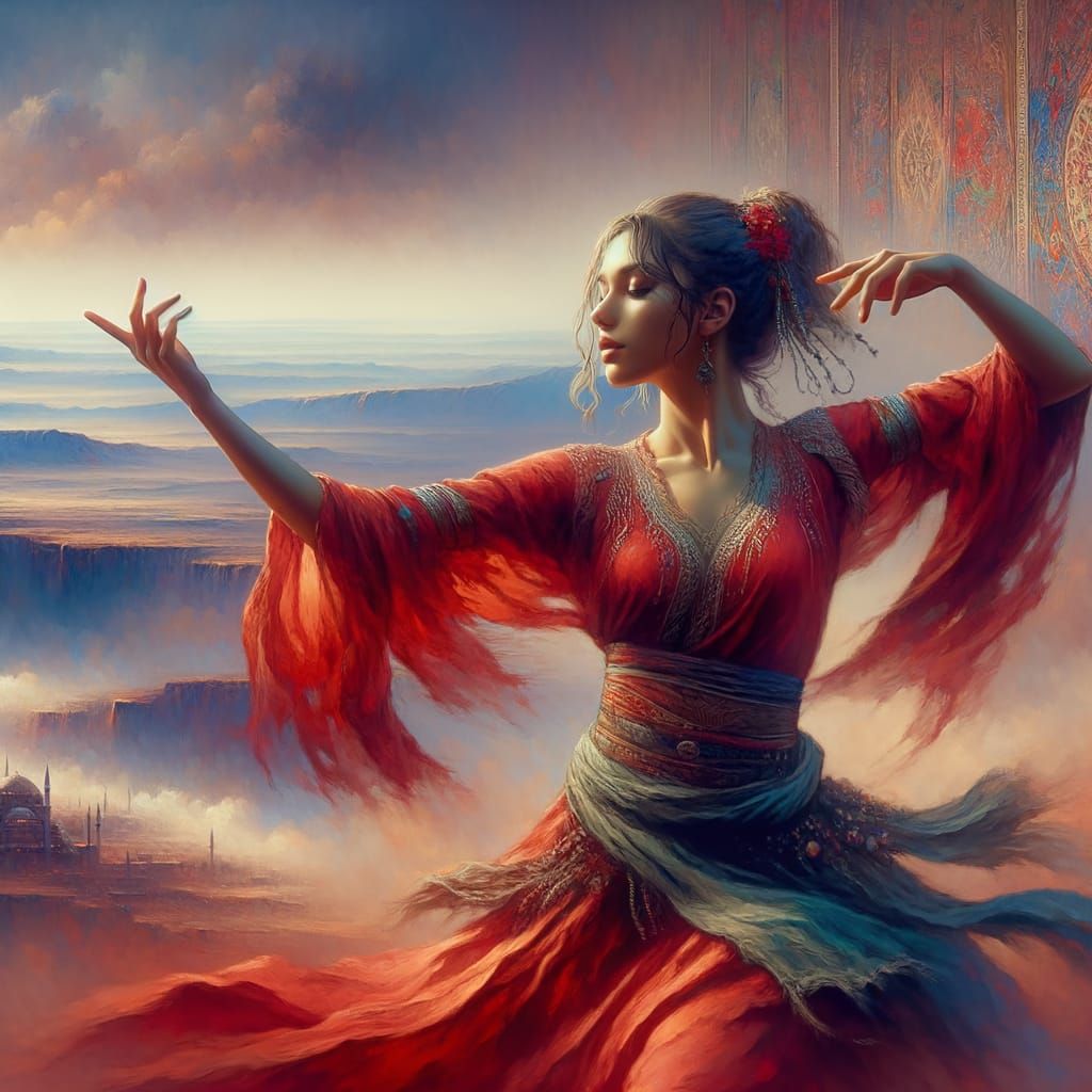 This image shows a Middle-Eastern woman in a red dress dancing passionately. The detailed matte painting features deep, intricate colors, reminiscent of traditional fantasy concept art, rendered in 8k resolution.