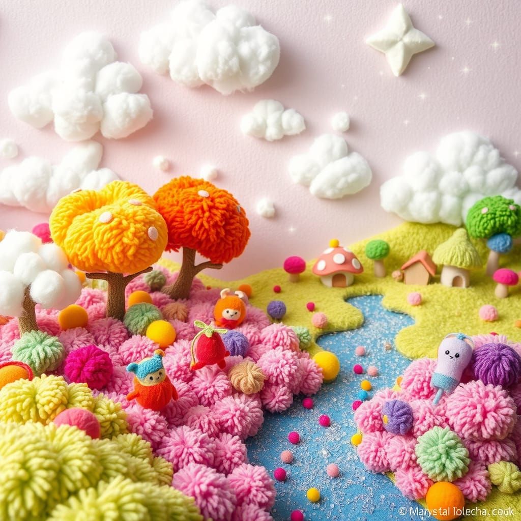 This image shows a whimsical landscape made of colorful pom poms, with fluffy rainbow trees and textured fields. Cute creatures dance near a sparkling river and mushroom houses under a pastel sky in a fiber art style.