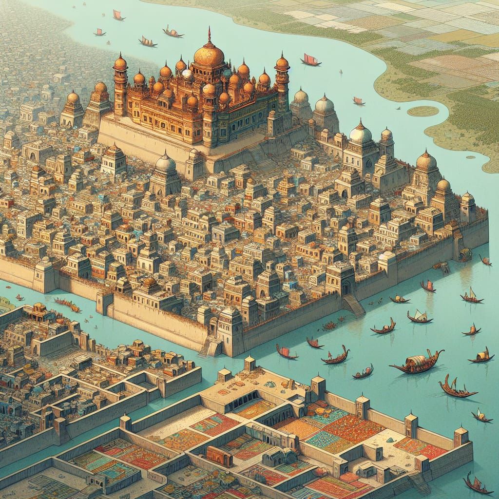 This image shows a detailed, top-down isometric map of an ancient trading city on a river delta. The city is filled with multi-story buildings and a grand bazaar, rendered in a 16th-century miniature painting style with warm colors.