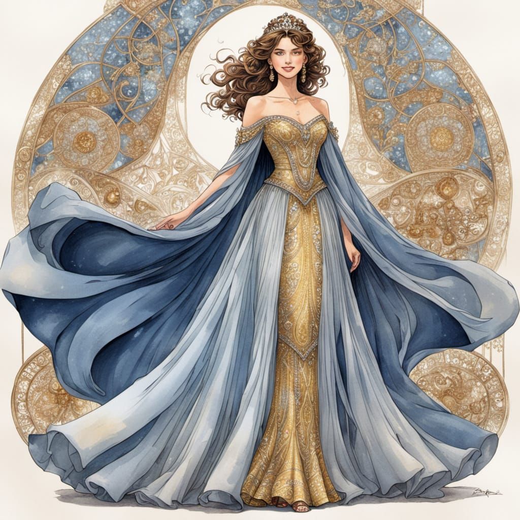 A young, smiling, extremely beautiful Princess in a intricately designed, flowing, beautiful ball gown, adorned with exquisite, sparkling jewelry, shining brightly, in the style of Milo Manara.