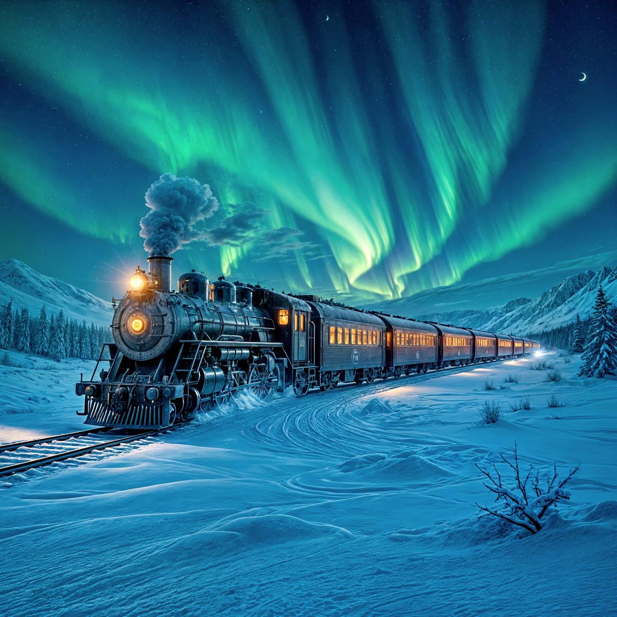 A vintage passenger train travels across a snow-covered plain, illuminated by the aurora borealis. Evokes cozy isolation and wonder, rendered in a painterly style with magical realism.