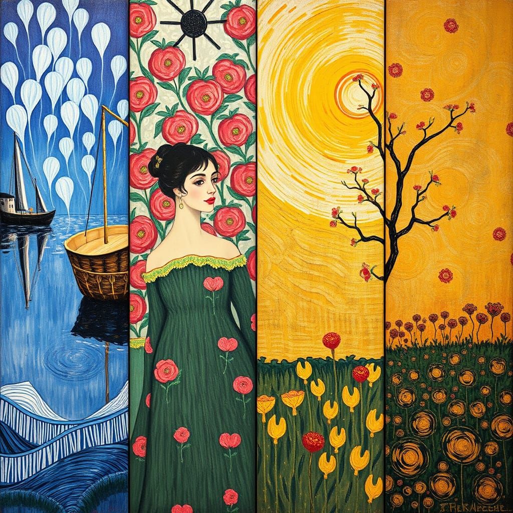 This image shows an artistic interpretation blending impressionist landscapes, art nouveau patterns, cartoon illustration, renaissance art, and post-impressionist brushstrokes.