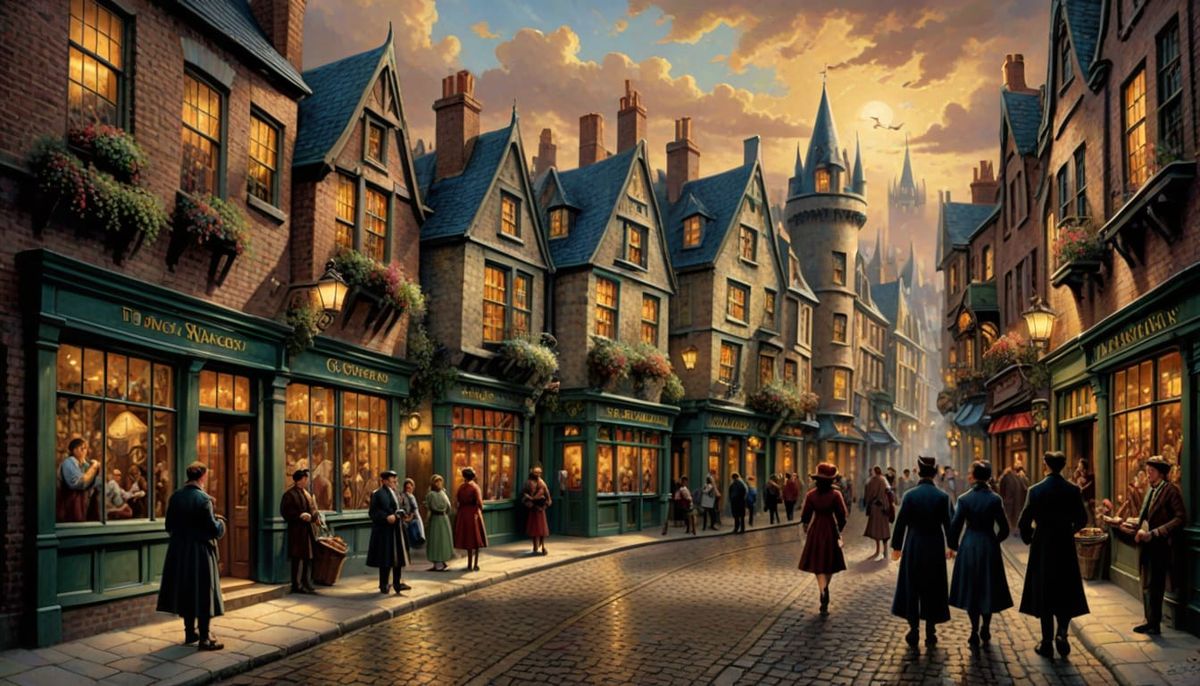 This image depicts the magical Diagon Alley in the distinct, luminous style of Thomas Kinkade, capturing a charming and inviting atmosphere.
